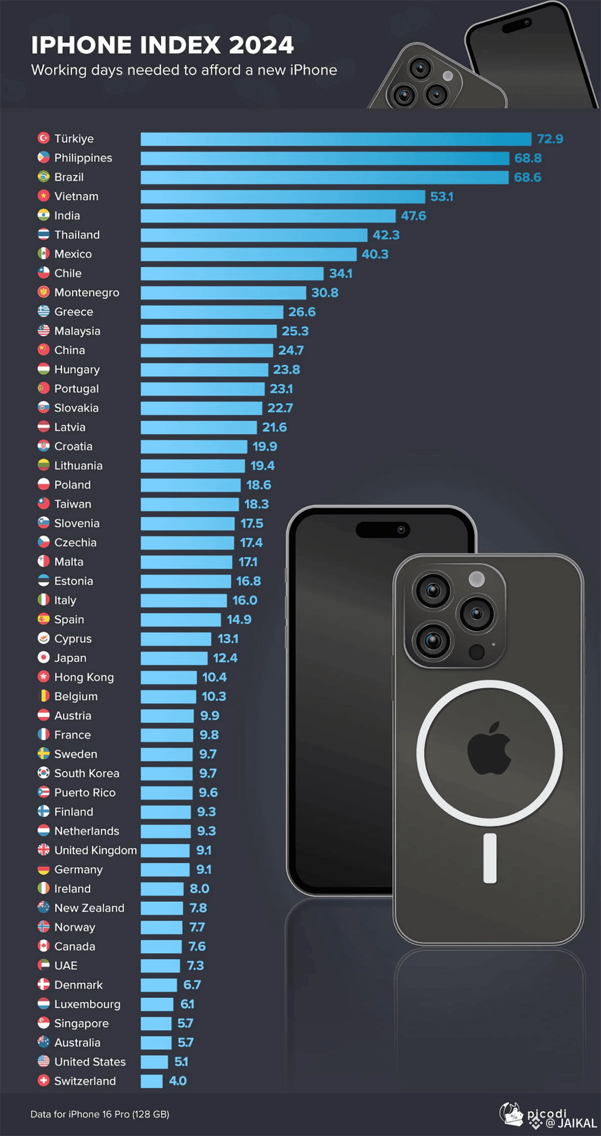 The latest data reveals a staggering gap in purchasing power for Apple’s iPhone 16 Pro (128GB). While a Swiss worker can afford it in just 4 working days, someone in Turkey must toil for 73 days—the longest in the world.