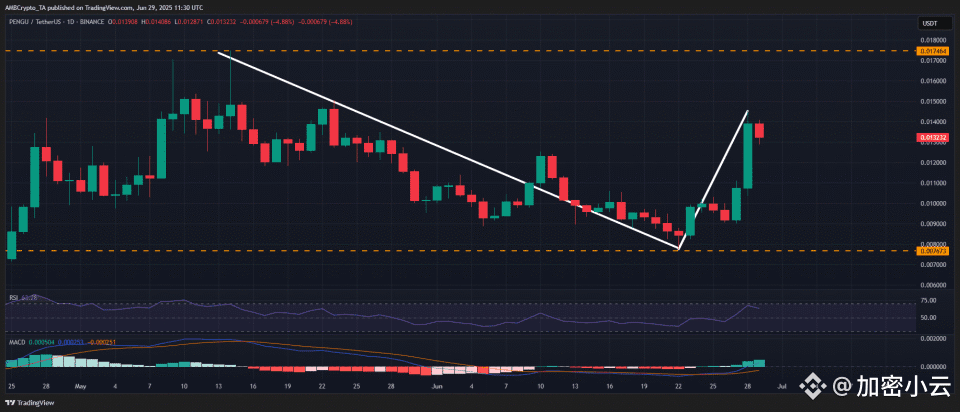 PENGU交易价格紧盯0.015美元关键阻力,上次在五月初也差点突破。这关口如果站稳,下一个目标是0.017美元甚至0.02美元,空间还挺大。