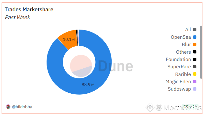 According to Dune Analytics, OpenSea handled 88.9% of all Ethereum-based NFT transactions last week. Blur came in second with a 10.1% market share.