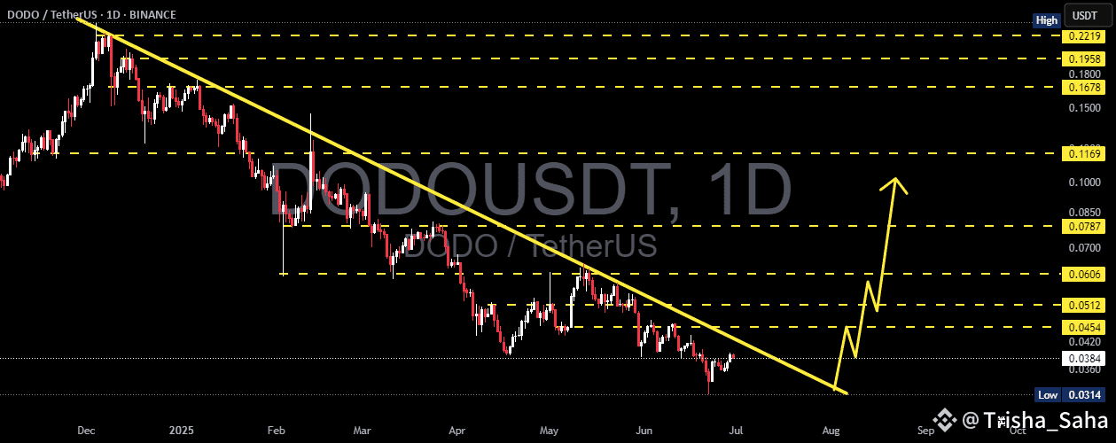 The DODO/USDT pair remains in a medium-to-long-term downtrend since late 2024. However, the current price action shows early signs of a potential reversal.