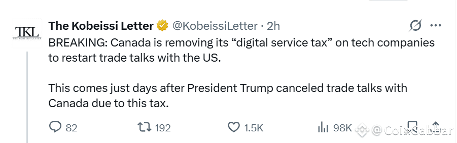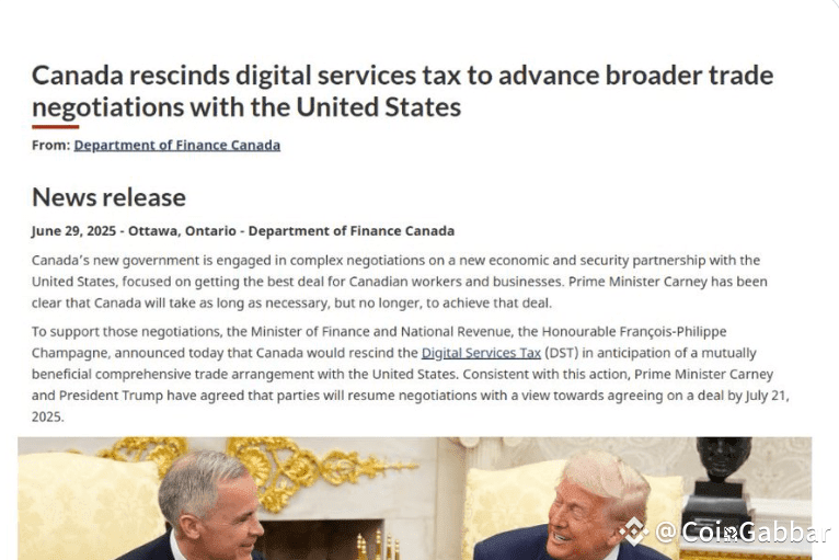 According to The Kobeissi Letter X post “ Canada is removing its DST on tech companies to resume US trade talks, following President Trump's cancellation of such talks due to the tax.” Nation made an interesting approach, but tax reduction is not certain when the government is minority. Right now, Trump's pressure was effective—it's truly an art of the deal. Will other countries dig in or reconsider their DSTs as a result of this? Global tax negotiations remain a muddle.