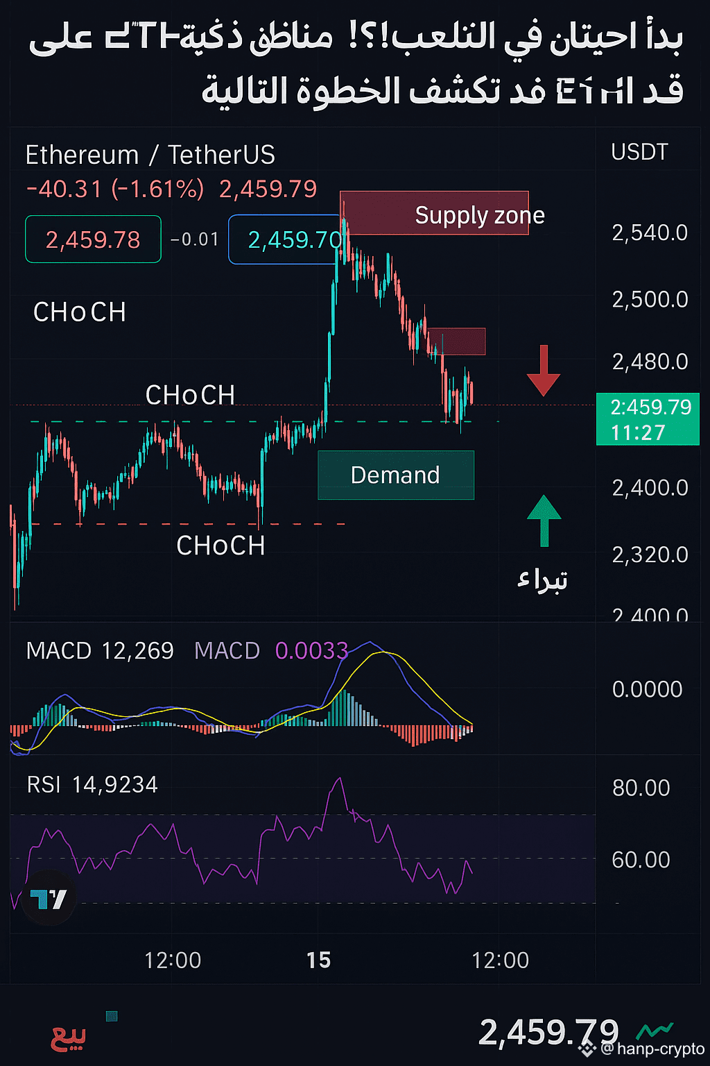 تحليل سلوك سعر الإيثيريوم اليوم على فاصل زمني 4 س باستخدام أدوات الهيكل السعري (CHoCH و BoS) مع تحديد مناطق الطلب والعرض، مما يعطينا لمحة عن تحركات "اللاعبين الكبار".