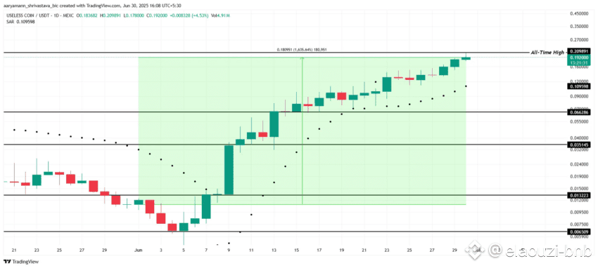 تصدرت عملة USELESS سوق الميم كوين في يونيو بارتفاع هائل بنسبة 1,635% ، مسجلةً أعلى مستوياتها التاريخية يوميًا تقريبًا. وبلغت العملة البديلة اليوم أعلى مستوى لها على الإطلاق عند 0.209 دولار أمريكي. يُظهر هذا النمو زخمًا قويًا، ويراقب المستثمرون عن كثب المزيد من التحركات الصعودية.