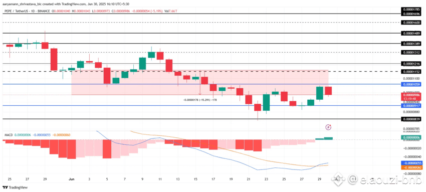 يُظهر مؤشر MACD أول تقاطع صعودي له هذا الشهر، مما يُشير إلى احتمالية تحول في زخم PEPE . قد يُساعد هذا العملة على التعافي من خسائرها الأخيرة والتقدم نحو مستوى المقاومة عند 0.00001216 دولار أمريكي. يُشير الارتفاع فوق هذه النقطة إلى مزيد من الصعود في الأسابيع المقبلة.