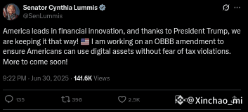 In a new series of posts on X, Senator Lummis shared her plans to protect digital asset users from what she calls unfair tax rules. She stressed that the country must keep moving forward as a global leader in crypto.