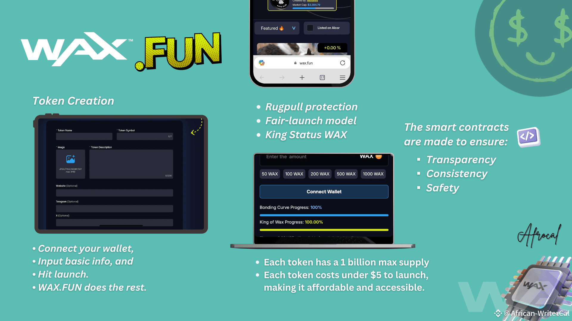 Wax.fun allows users to create tokens without presales, team allocations, or backdoor advantages. Every token follows the same core structure only the name, image, and optional metadata (like social links) vary.