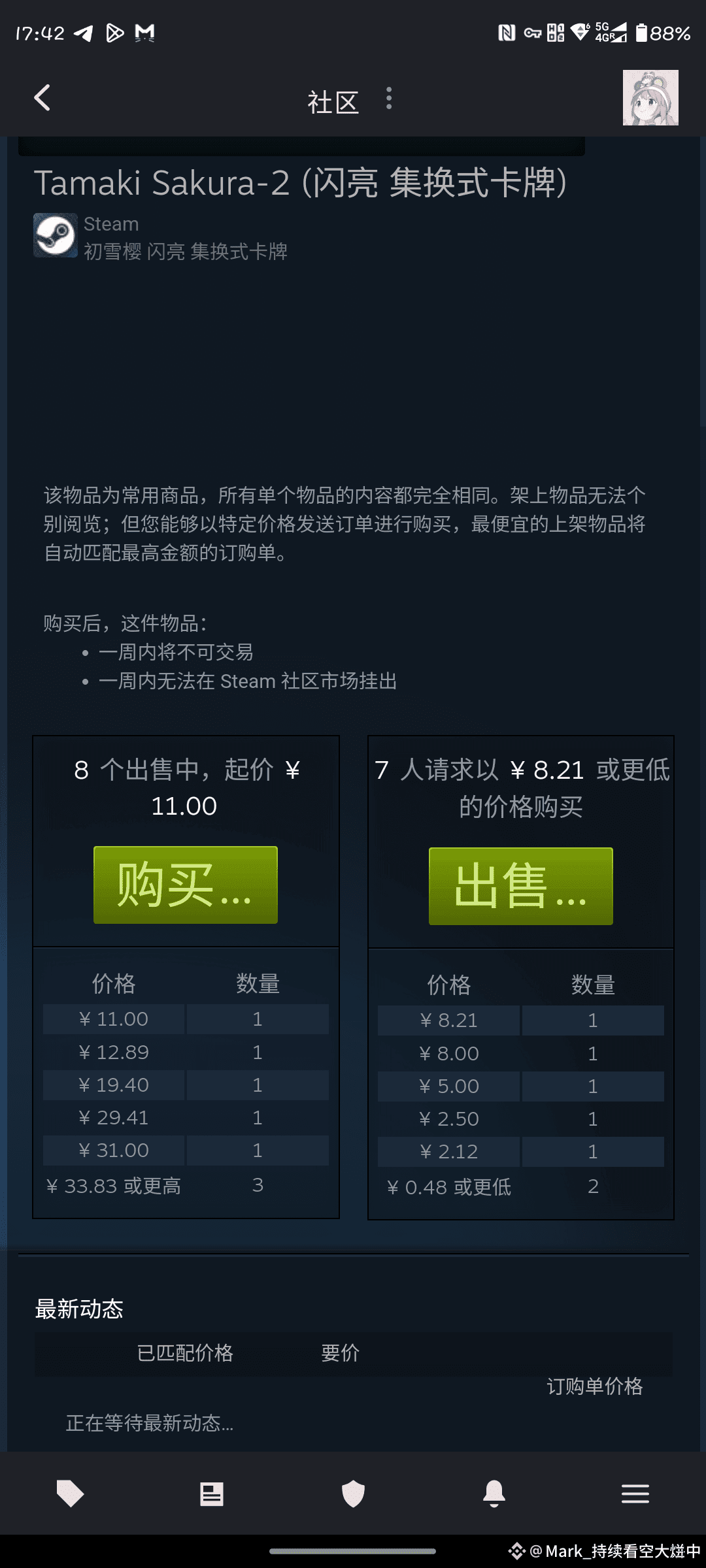 我steam偶然获得了一张闪卡,我想把它卖掉,然后获得16块钱。