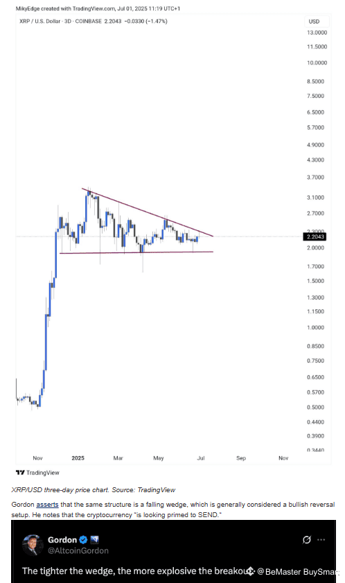 Gordon asserts that the same structure is a falling wedge, which is generally considered a bullish reversal setup. He notes that the cryptocurrency “is looking primed to SEND.“