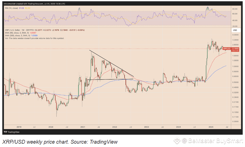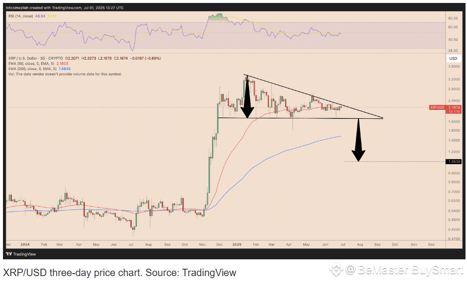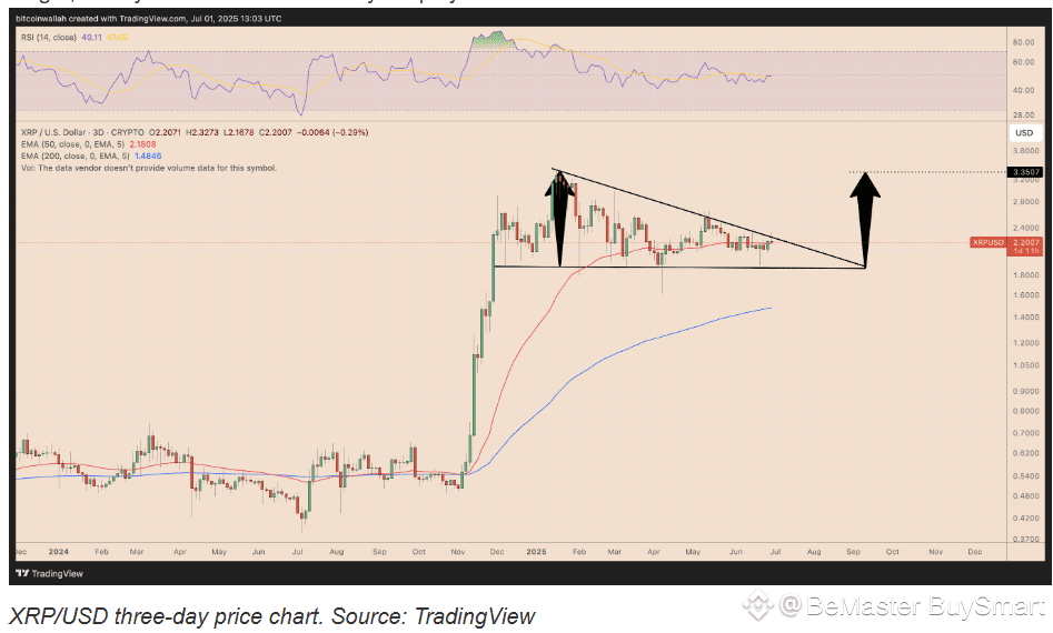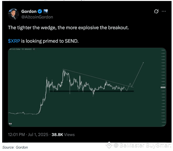 Mikybull says XRP is “still coiling up for a bigger move,” pointing to a descending triangle pattern.