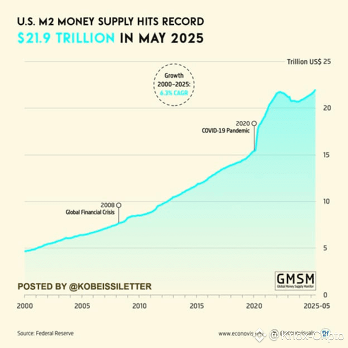 Según datos publicados recientemente por la cuenta en X de The Kobeissi Letter, en mayo el M2 estadounidense alcanzó los $21.94 billones. Esto abarca la cantidad de efectivo, cuentas de ahorro, corrientes y de depósito hasta finales del mes de mayo.
