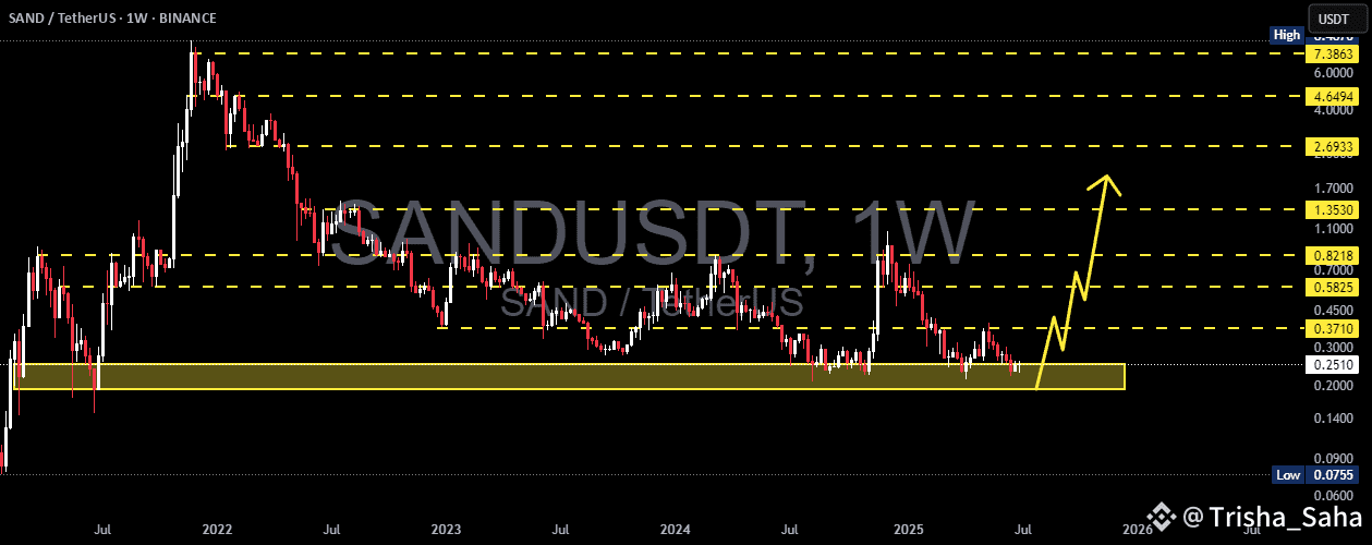 The SAND/USDT weekly chart shows the price currently hovering around a historically strong support zone between $0.20 – $0.25. This yellow-marked demand area has been tested multiple times since 2021 and has consistently prevented further downside, making it a crucial decision point for both bulls and bears.