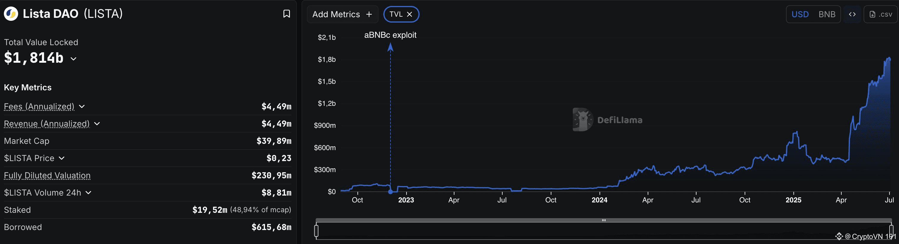 Chỉ trong 2 tháng ngắn ngủi, dự án #ListaDao đã gây bão trên DeFiLlama với mức tăng trưởng TVL không tưởng, từ 400 triệu USD ➡️ hơn 1,8 tỷ USD, ghi nhận hiệu suất hơn 450%