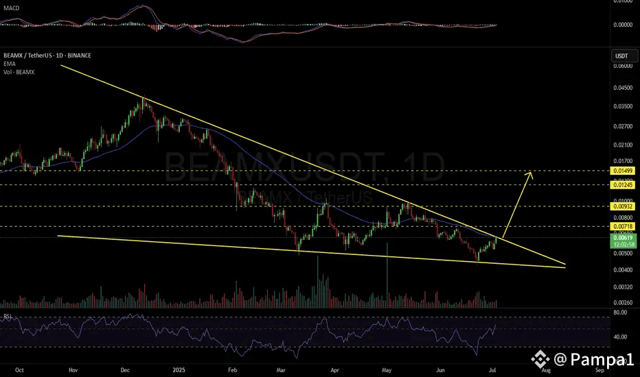 BEAMX is testing a key range ($0.0054–$0.0066) after a rounded-bottom recovery.