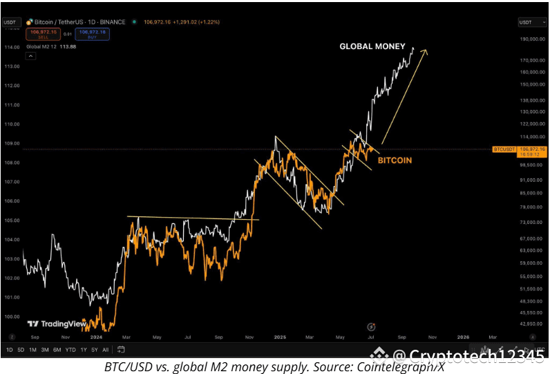 A clear correlation has been evident throughout Bitcoin’s history, with BTC/USD following M2 both up and down with a slight delay.