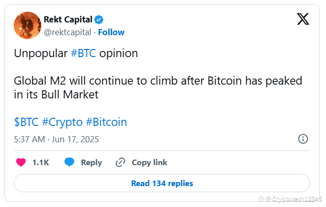 This month, trader and analyst Rekt Capital acknowledged that M2 can continue rising even after Bitcoin sees a bull market blow-off top.