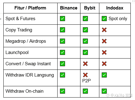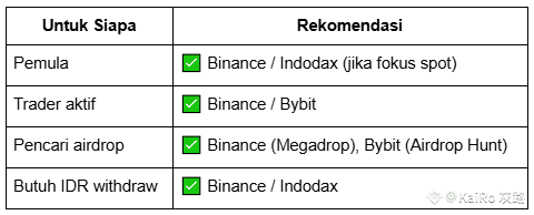 Dari pengalaman pribadi, Binance unggul dalam kemudahan beli crypto, fitur produk yang lengkap, fee yang kompetitif, dan user experience yang lebih mulus. Indodax cocok untuk spot trading dasar dan pengguna lokal, tapi belum cukup untuk eksplorasi DeFi atau fitur lanjutan. Bybit cocok untuk trader aktif, tapi agak rumit di awal onboarding.