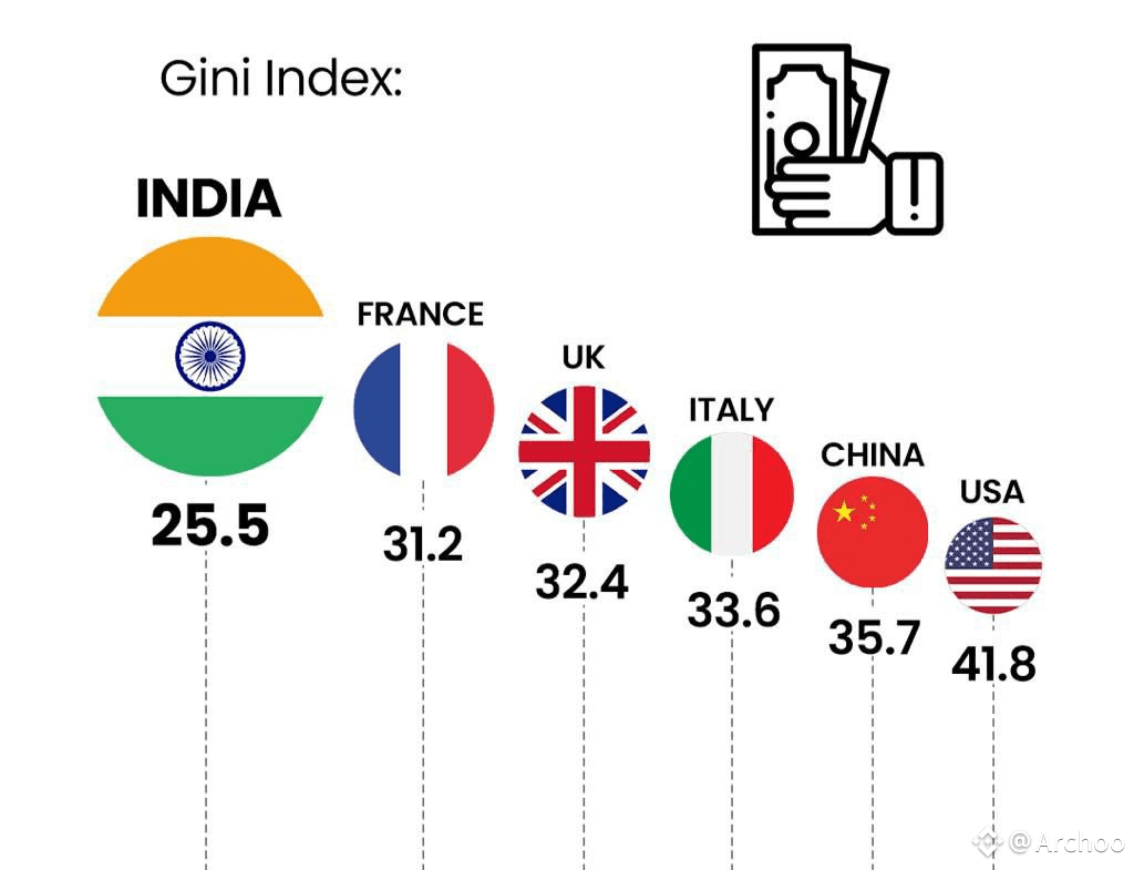 According to the latest World Bank data, India’s Gini Index stands at 25.5. This places India among the most equal countries in the world in relative terms. India’s score is much lower than China’s 35.7 and far lower than the United States, which stands at 41.8. It is also more equal than every G7 and G20 country, many of which are considered advanced economies.