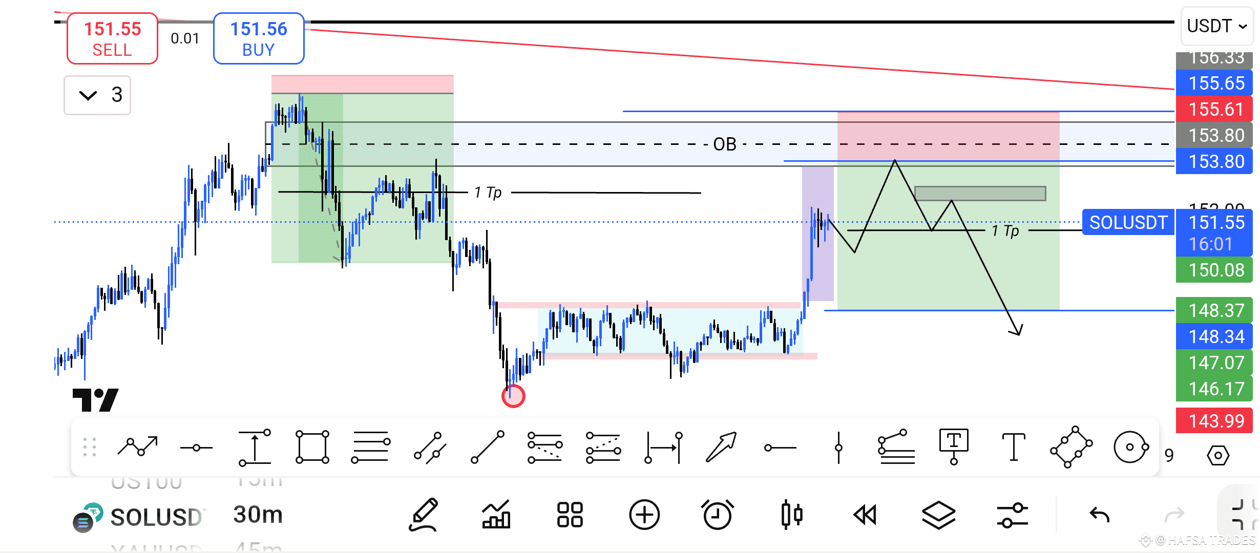 "This is an Solana trade, and as you can see, the market was also filling up here previously. I had taken a sell trade from this same level and it was a winning trade. Today, the price is at the same level again. At this level, if you take a trade with a 1:1 risk-to-reward ratio, you should book your profit and move your stop-loss to break-even (50%) to secure your position."