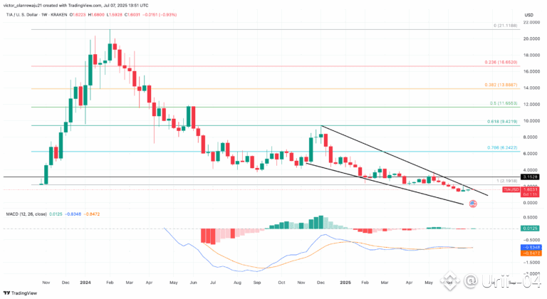 TIA formed a descending resistance line starting in March 2024, which it finally broke on July 3. This breakout was confirmed by a long daily candle and volume spike, validating the move as significant. Since then, the price has surged 35%, reaching a weekly high of $8.10.