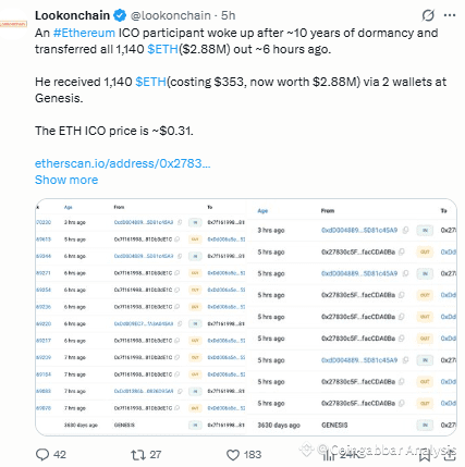 An Ethereum whale just woke up after nearly a decade of inactivity, and it's turning heads across the crypto industry. Around six hours ago, this early ICO participant moved all 1,140 ETH, now worth about $2.88 million, out of two Genesis wallets as reported by the Lookonchain. Back in 2015, the total cost of that ETH was just $353. Which makes a percentage increase of almost 81,500%.