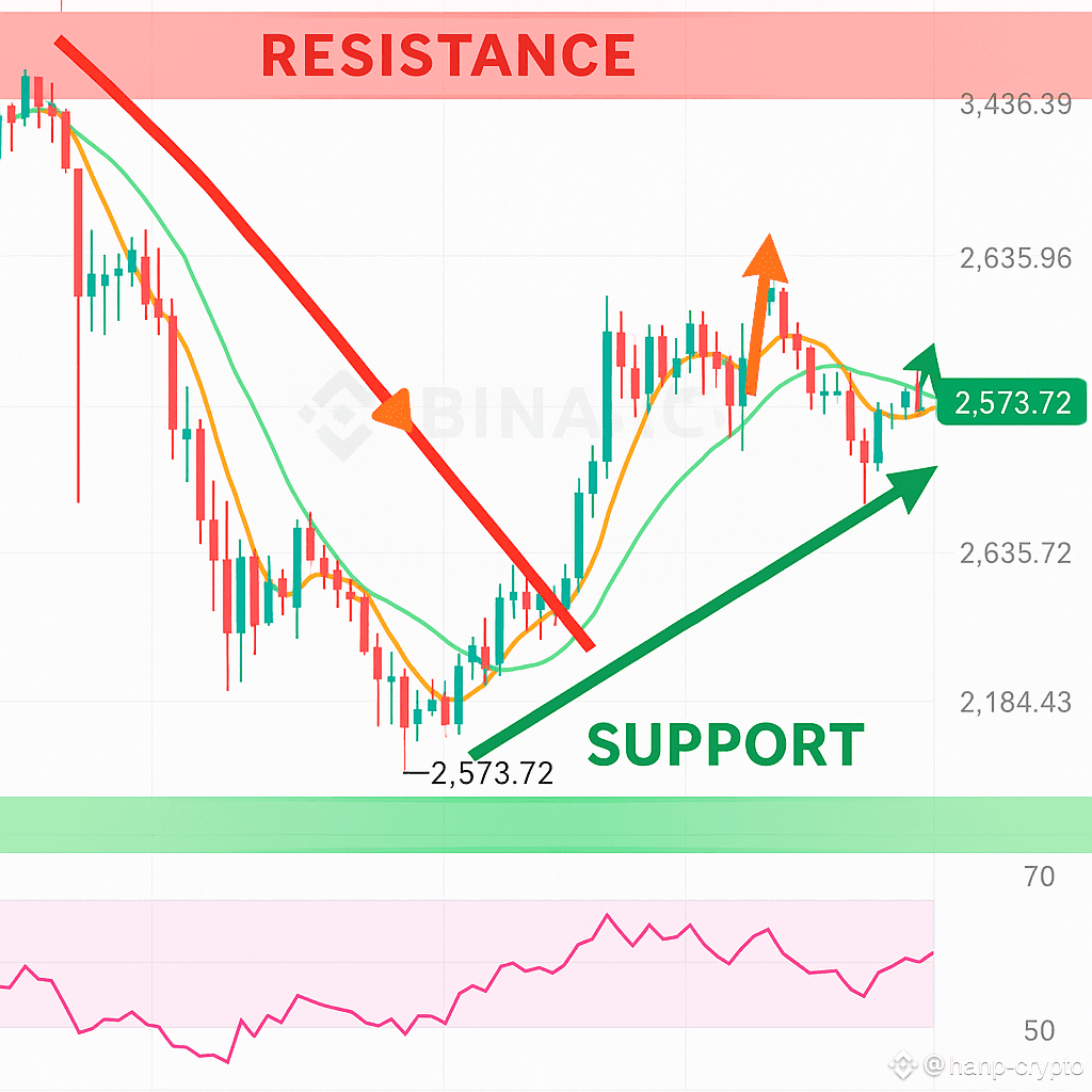 بعد هبوط قوي من القمة التاريخية، السعر كون قاع عند 1384$ وبدأ يرتد بشكل تدريجي نحو مستويات 2500+، وهو الآن يحاول الثبات فوق المتوسطات المتحركة.