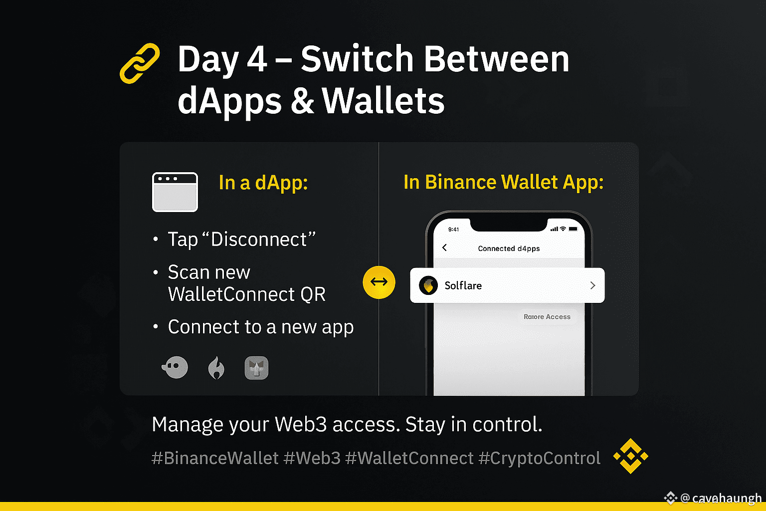 In Binance Wallet: under Connected dApps, manage access or switch wallet accounts.