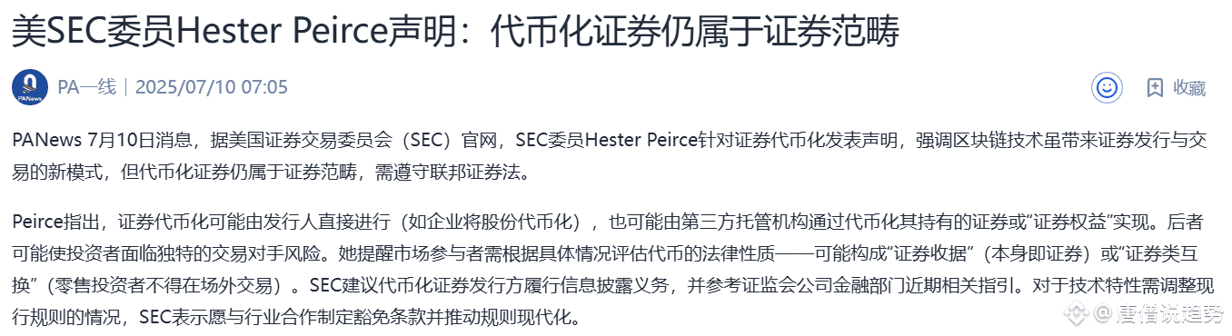 唐僧解读:Peirce虽以开放态度著称,但此次声明彻底堵死“链上证券游离于监管”的幻想,RWA项目合规成本飙升,中小团队恐遭清洗!