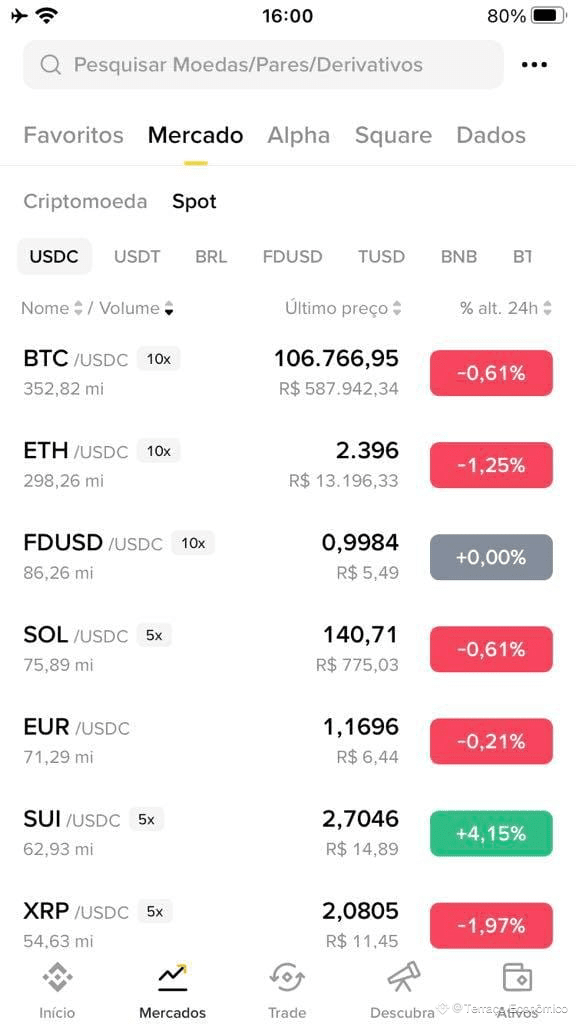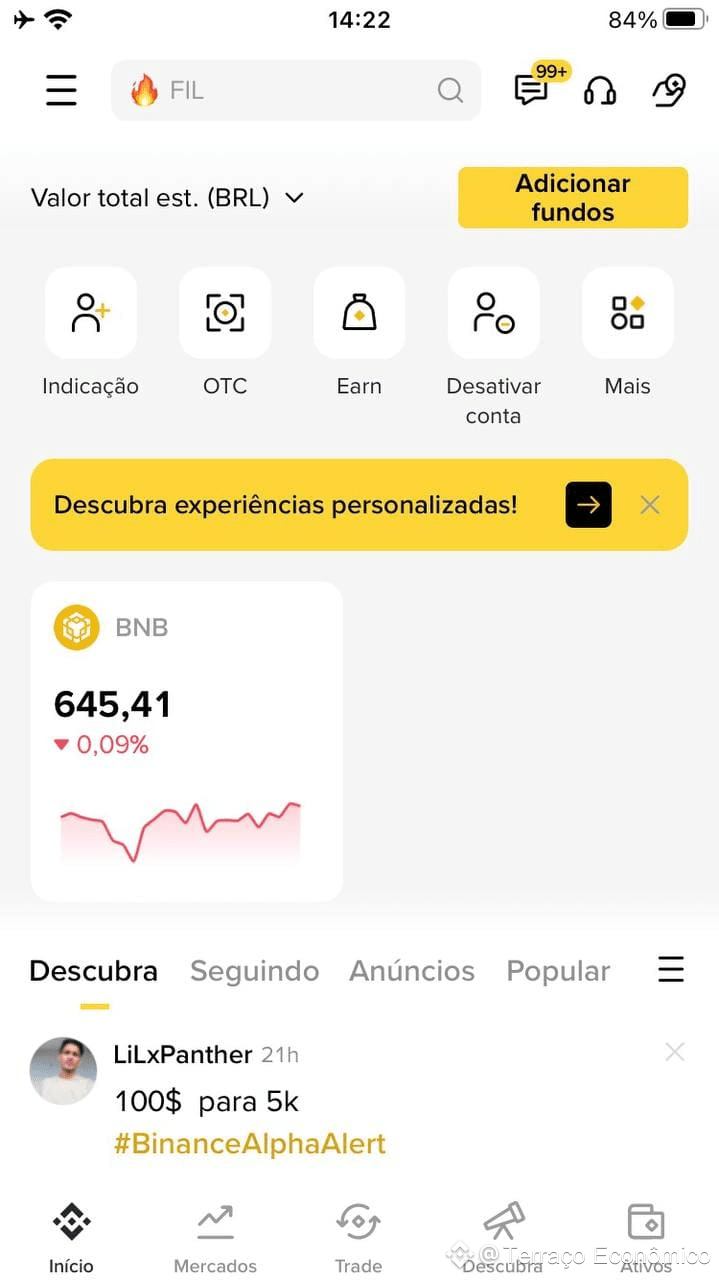 A Binance abre com um dashboard totalmente personalizável (widgets, notícias do Binance Square, atalhos para Earn, OTC, etc.). O menu fixo no rodapé (Início, Mercados, Trade, Descubra, Carteira) facilita a vida de quem troca de seção o tempo todo.