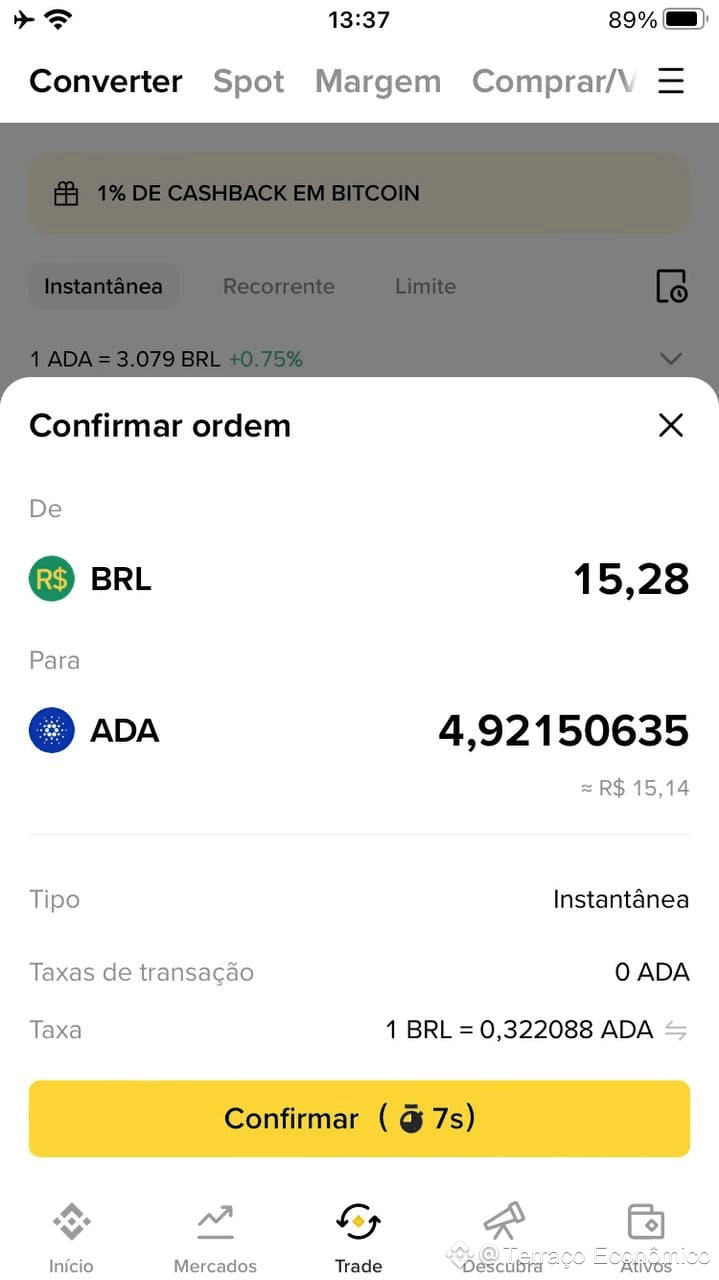 Na Binance, usamos o recurso de conversão instantânea, com cotação de 1 BRL = 0,322088 ADA. O valor total convertido foi de 4,92150635 ADA, com zero de taxa, o que garante transparência e aproveitamento máximo do valor investido.