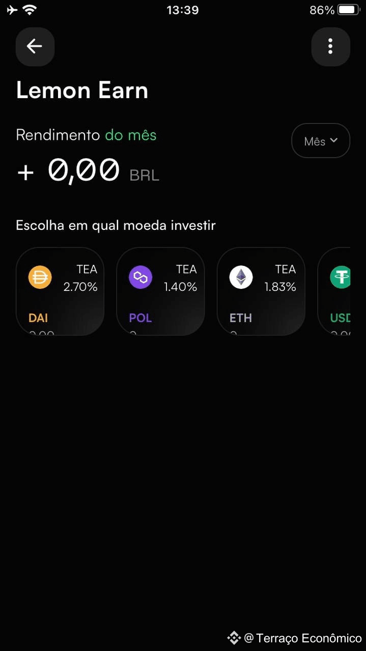 Já na Lemon, a experiência é bem mais enxuta. Ao acessar a aba "Lemon Earn", encontramos apenas seis opções de tokens para rendimento passivo, incluindo DAI, POL, ETH e USDT. As taxas variam entre 1,4% e 14% ao ano, e não há diferenciação entre tipos de staking ou resgate flexível/bloqueado. Além disso, o layout é mais limitado: o app mostra apenas o rendimento acumulado no mês, sem histórico mais amplo ou projeções futuras.