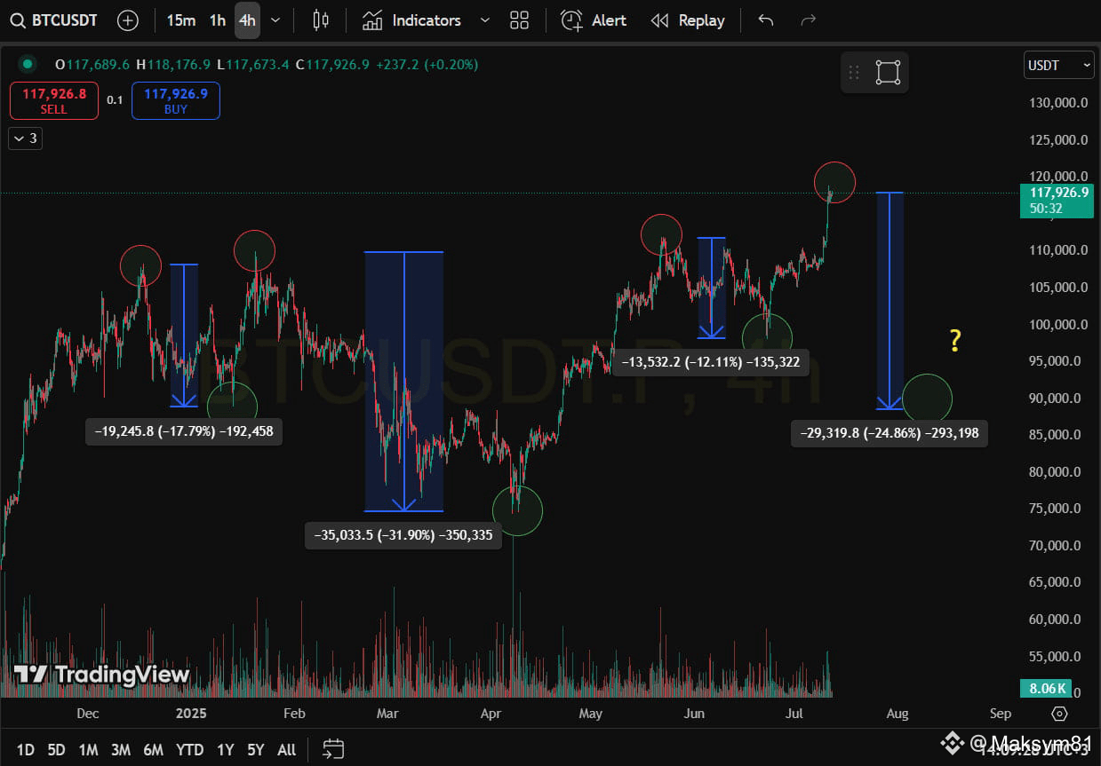 і ціна йде на коррекцію🟢-17% І коли ми перебиваємо ATH ми вже йдемо на набагато глибшу корекцію аж на 31%. Далі ситуація повторюється в правій частині графіку. Ми ставимо ATH🔴 і ціна йде на коррекцію🟢-12%