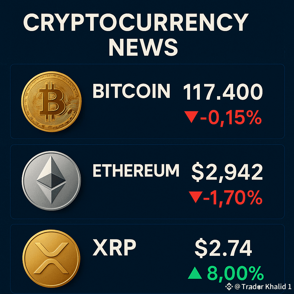 Trailing behind today with a slight dip (~–0.15%)—trading around $117.4K after reaching intraday highs near $118.2K.