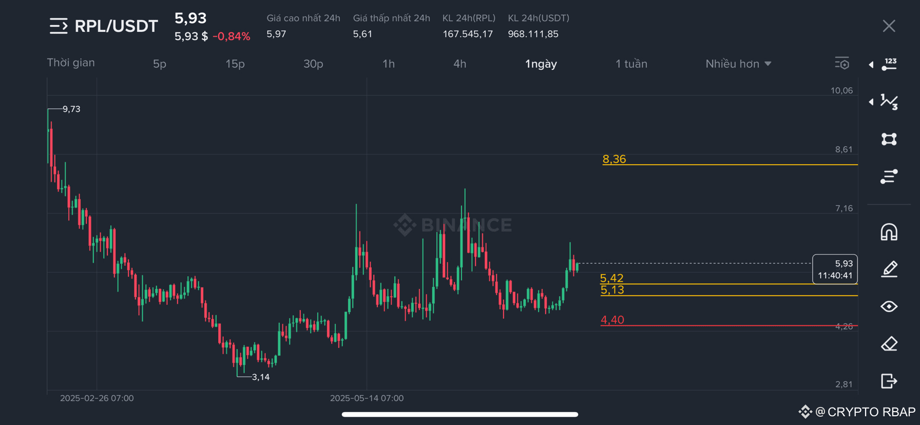 Vùng entry cho spot khoảng 5.4 - 5.14 ~ 5% mọi người cân đối vol và canh entry phù hợp. Em lăn nửa người vào tại entry 5.4 nhá