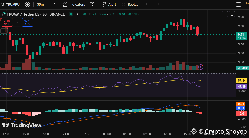 Following its recent surge, #TRUMP is stabilizing and is currently trading at 9.82. The 4H chart indicates hints of recovery, and if momentum picks up, a new breakout appears imminent.
