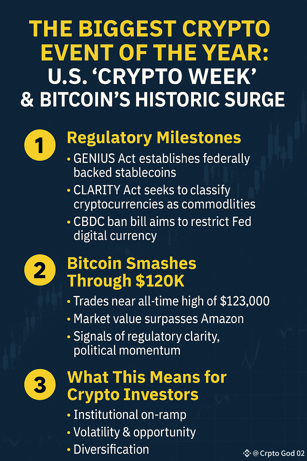 “Crypto Week” marks a turning point. For the first time, U.S. lawmakers are actively engaging with crypto—not just regulating it, but integrating it into the financial mainstream. Paired with Bitcoin’s climb past $120K, this is a powerful narrative of legitimacy and momentum.