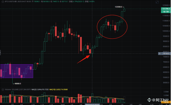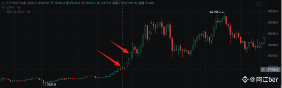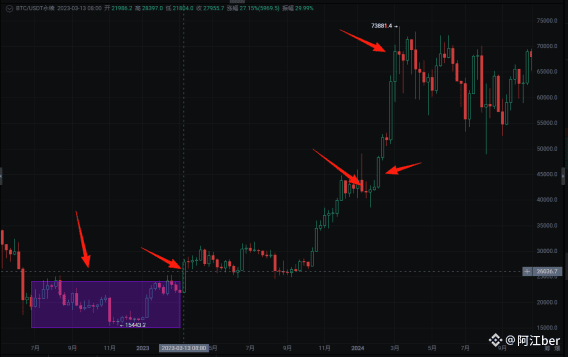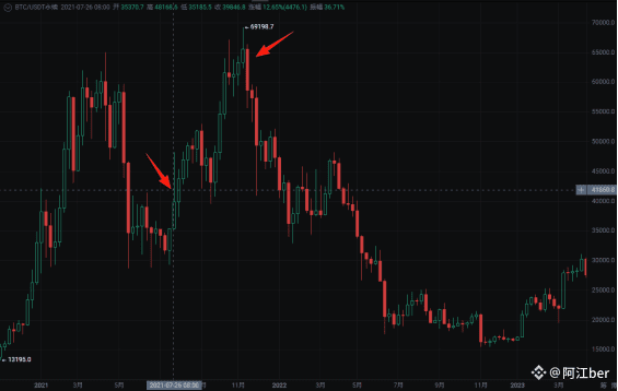 3. 第三次庄家建仓在k线图里这根k线,在股市里这是著名的“仙人指路”形态(通常预示庄家建仓),而后都代表了庄家建仓,考虑市场波动,建仓均价约为42,000美元。出货目标价约为42,000 × 1.6 = 67,200美元。价格达到该新高点后,庄家开始出货引发下跌。