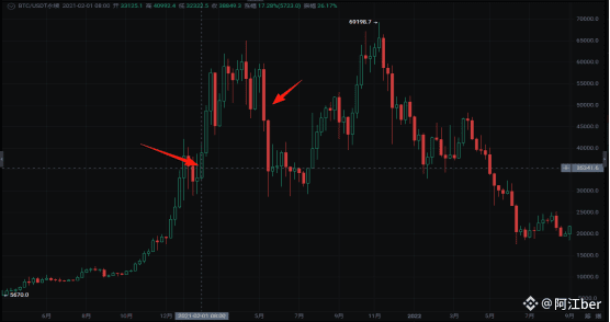 2.第二次庄家建仓K线图显示一根标志性大阳线,建仓成本约35,000美元。出货目标价约为35,000 × 1.6 = 56,000美元。价格达到该区域后庄家开始出货引发下跌,随后发生了众所周知的“5.19”事件,BTC价格腰斩。