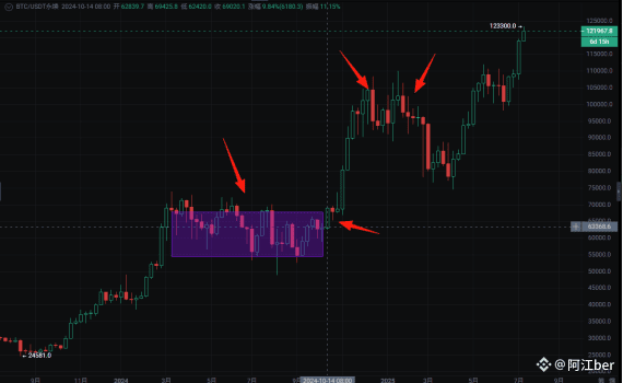 5. 第五轮庄家横盘出货及散户行为导致市场波动后,约在2024年10月开启第六轮建仓,成本约63,000美元。出货目标价约为63,000 × 1.6 = 100,800美元。价格达到该区域后开始横盘出货,随后下跌。