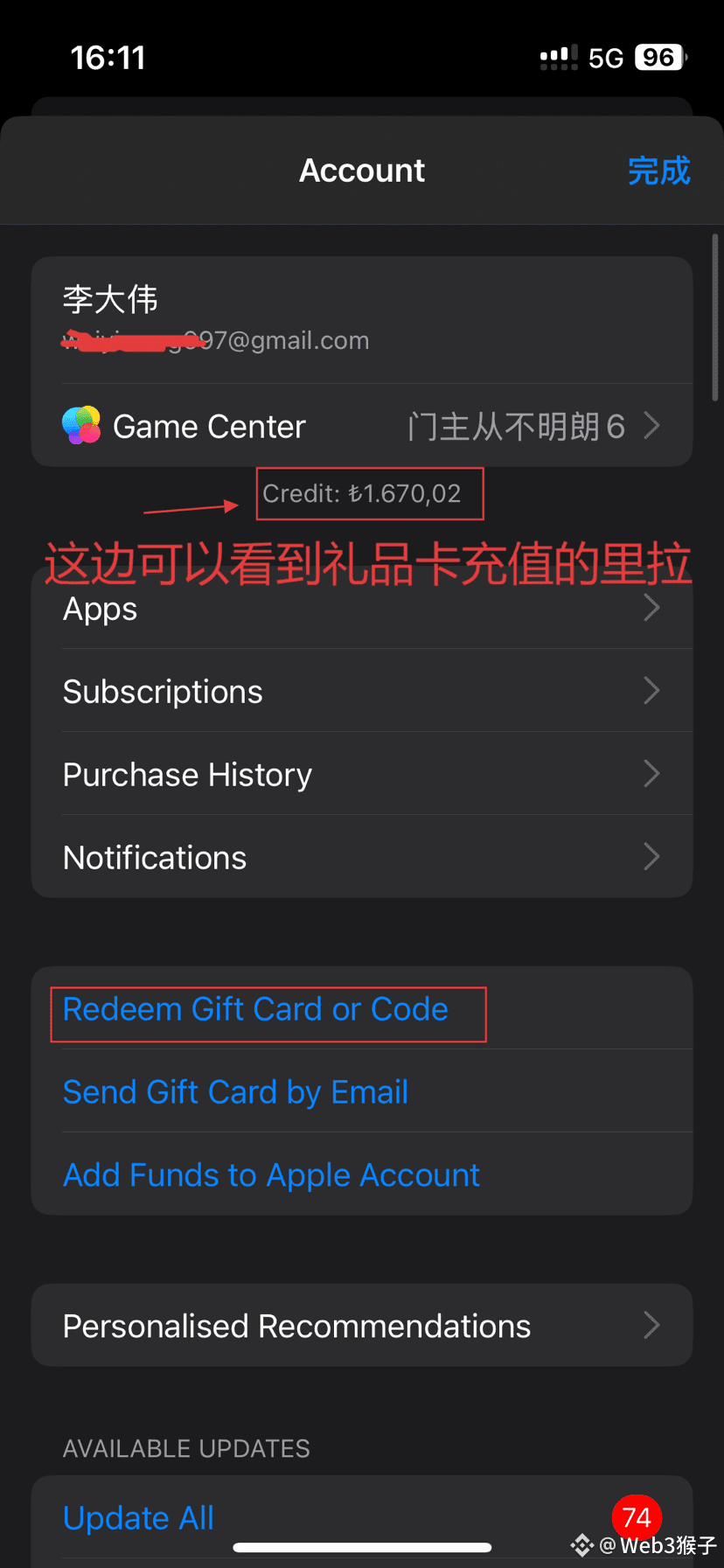 3.登入上土耳其账户点击Redeem Gift Card or Code(也就是兑换礼品卡或代码),将你在咸鱼购买的礼品卡代码填写进去,就能看到你的账户充值了多少里拉