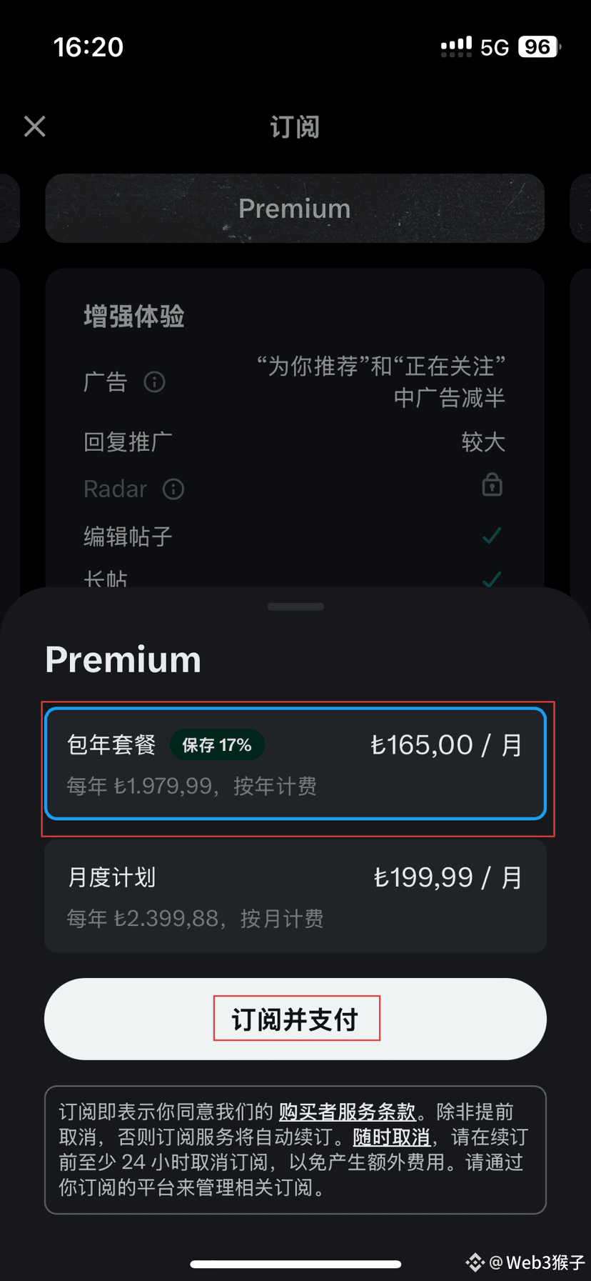 4.删除掉之前的X,以苹果ID为这个土耳其账户重新去下载一个X,并且VPN也使用土耳其节点,登入上X进行蓝V认证,目前土耳其的蓝V认证价格是在1979.99土耳其币左右(折合人民币是354元),比其他地区的蓝V认证价格要接近少一半#蓝v互关 #蓝v认证 #BTC突破12万大关 #币安8周年