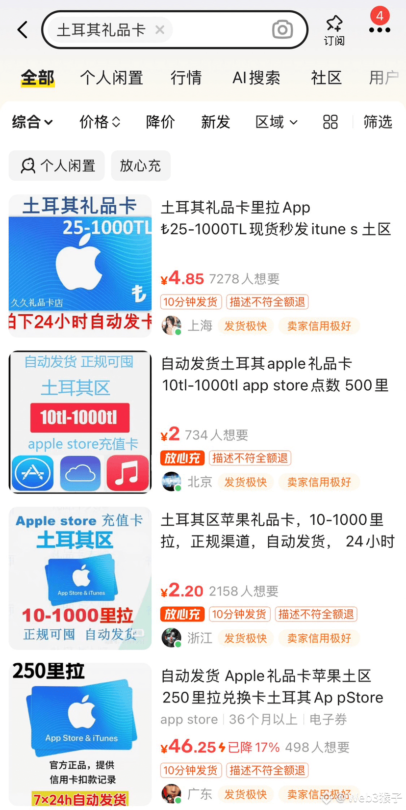2.注册完毕后在App Store登入,随后打开咸鱼搜索《土耳其礼品卡》,看蓝v认证价格为多少(具体价格需实时观看X),购买对应的礼品卡
