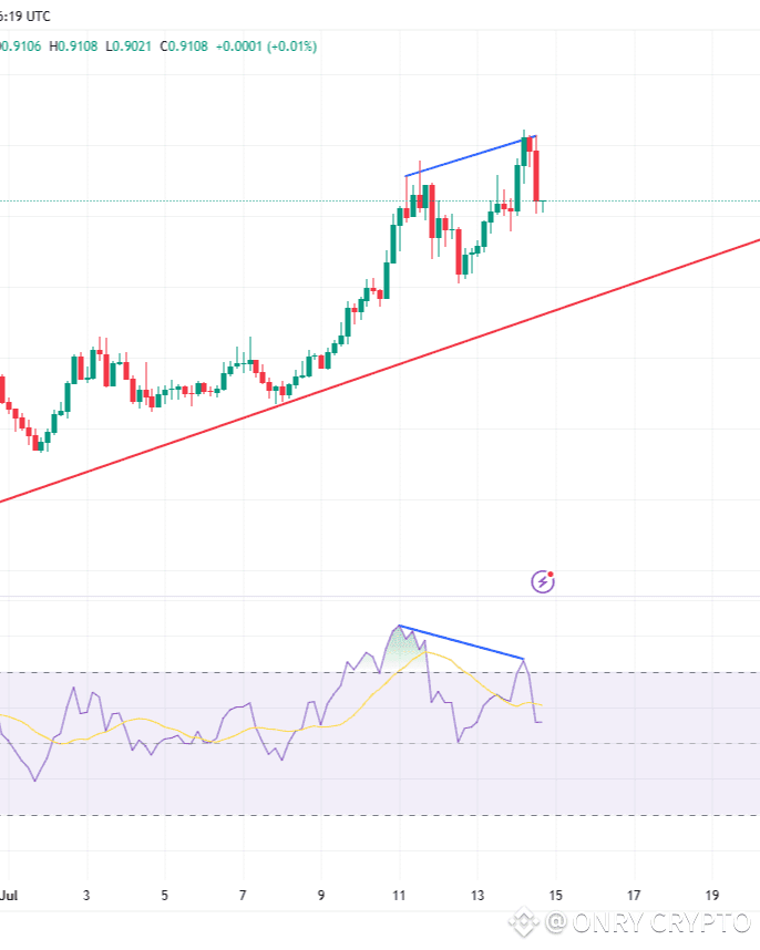 This 4-hour ONDO/USDT chart shows a strong bearish divergence. Signals weakening bullish momentum. If selling pressure continues, ONDO may test lower support levels.