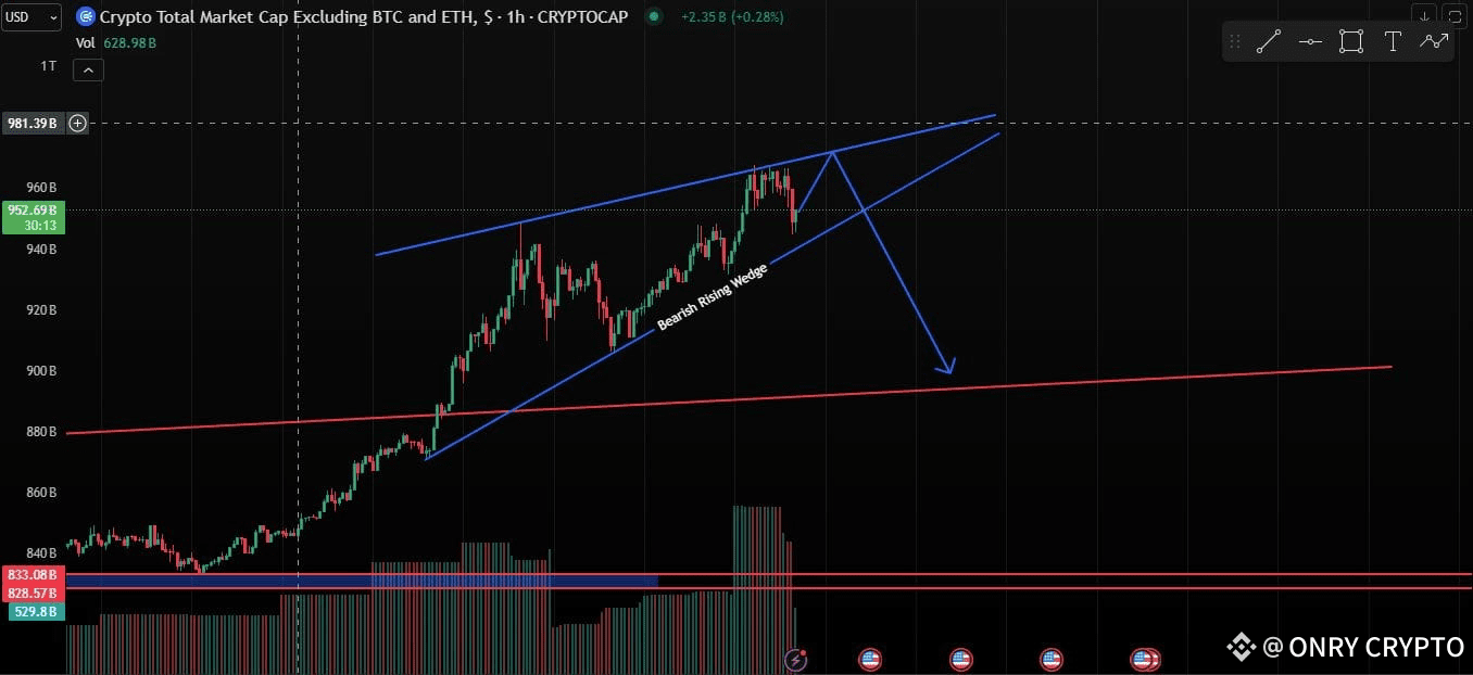 1-hour chart of the crypto total market cap shows a bearish rising wedge pattern, typically signaling a potential reversal. Price is testing the wedge’s upper boundary but facing rejection. A breakdown from the wedge could trigger a drop toward the red support zone around $880B or lower.