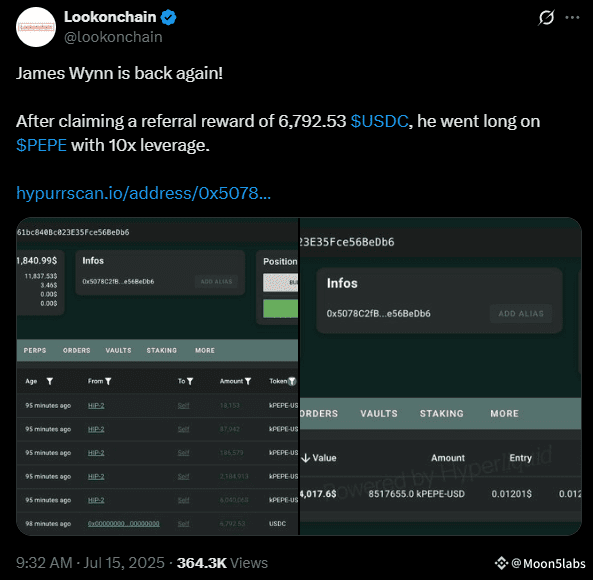 James Wynn, a well-known crypto trader who previously lost hundreds of millions on the Hyperliquid platform, is back in the game – and once again risking it all. After mysteriously disappearing from social platform X last Sunday, Wynn has returned with a new strategy, this time focusing on the memecoin PEPE and stablecoin USDC.