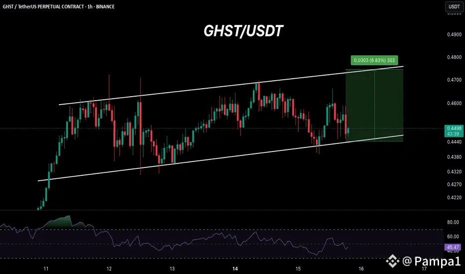 On Binance, GHST shows mild upward pressure with accumulation signs, calling the $0.445–$0.452 range a long-entry zone.