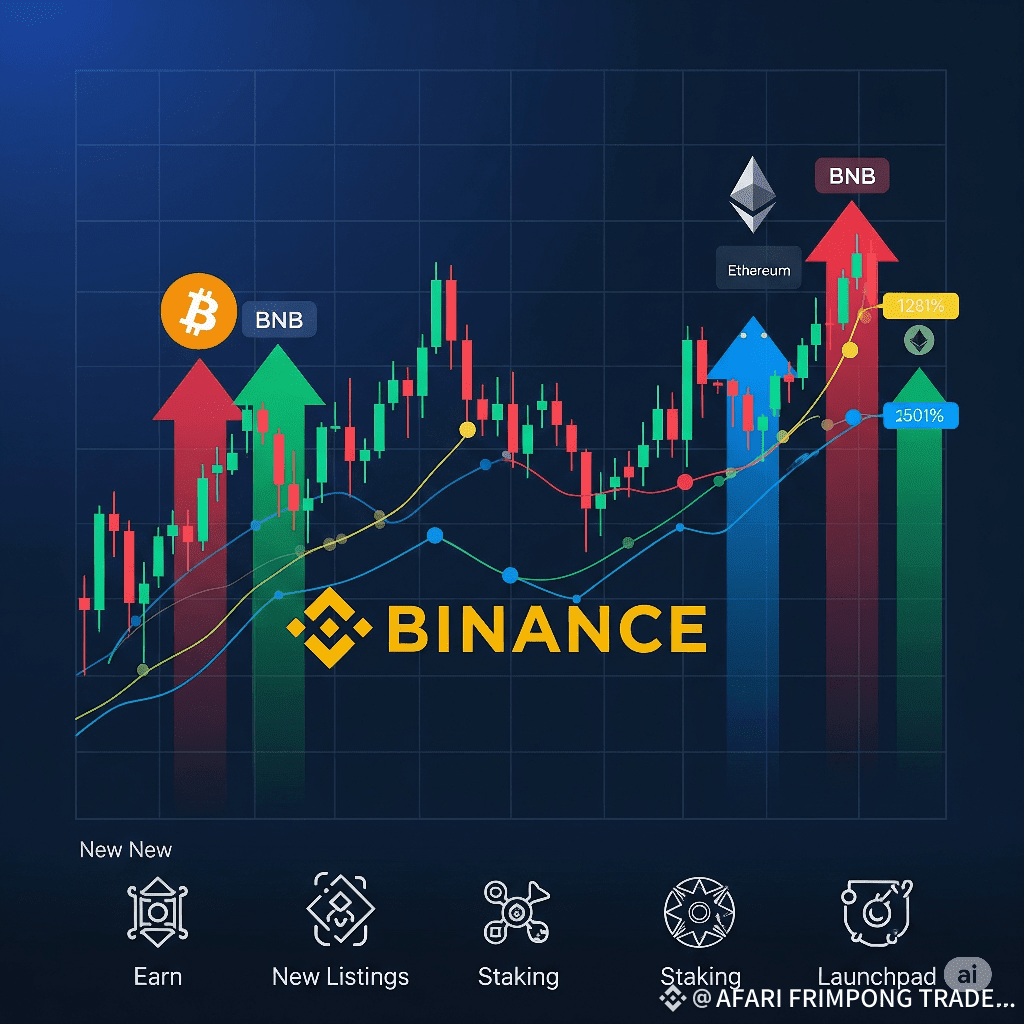 Image Suggestion: A vibrant graphic featuring the Binance logo, upward-trending candlestick charts for BTC, ETH, and BNB, and small icons representing new features like "Earn" or "New Listings." The overall aesthetic should be modern and engaging.