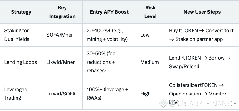 Likwid Integration Strategy: Lend rtTOKENs in isolated markets for permissionless borrowing/lending, earning fees + rebases. Example: Lend rtCIC as collateral, borrow stablecoins, swap to more ltCIC, and loop; amplify yields by 2-5x while rtTOKENs rebase daily. New users: Access via likwid.fi; oracle-free design reduces fees and risks contagion.
