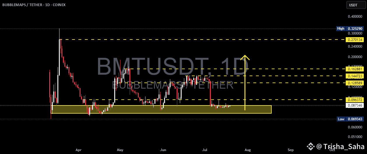 The daily chart of BMT/USDT reveals a compelling structure for traders looking to capitalize on early-stage reversals and bottom entries. The price is currently consolidating within a strong historical demand zone, ranging between $0.069 – $0.087 USDT — a level that has previously triggered multiple significant rallies (March, May, July 2025).