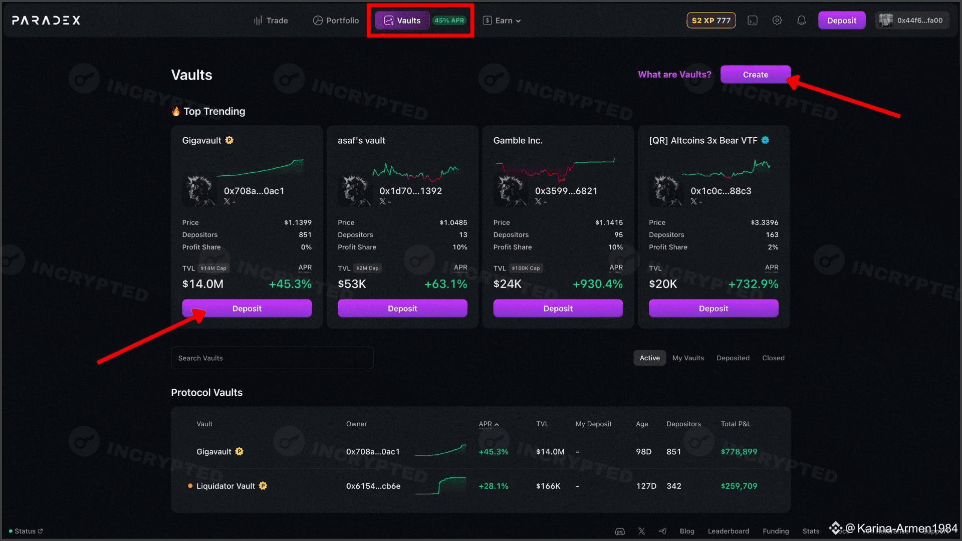 Помимо торговли, у пользователей есть возможность предоставить свои средства другим трейдерам или непосредственно Paradex для поддержания ликвидности. За что можно получать APR и поинты. Для этого переходим на вкладку Vaults, выбираем пул или создаем свой и вносим средства:
