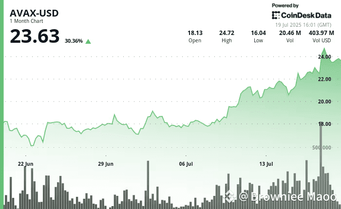 Avalanche's native token AVAX soared 30.3% over the last 30 days, vastly outperforming Bitcoin's 13.4% gain over the same period AllSides+14CoinDesk+14TokenPost+14. Though it pulled back slightly—about 0.5%—to around $23.63 in the past day, the breakout is unmistakable Binance+3CoinDesk+3Stocktwits+3.